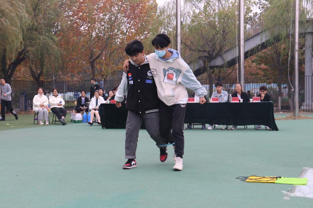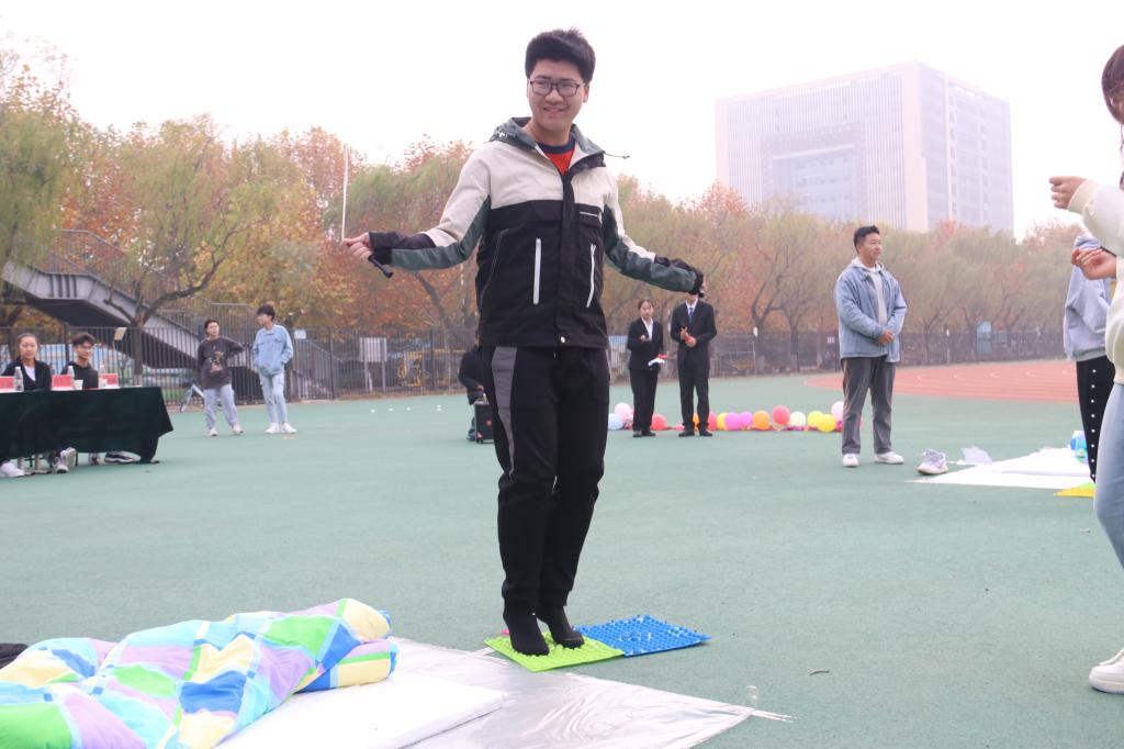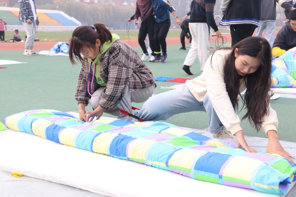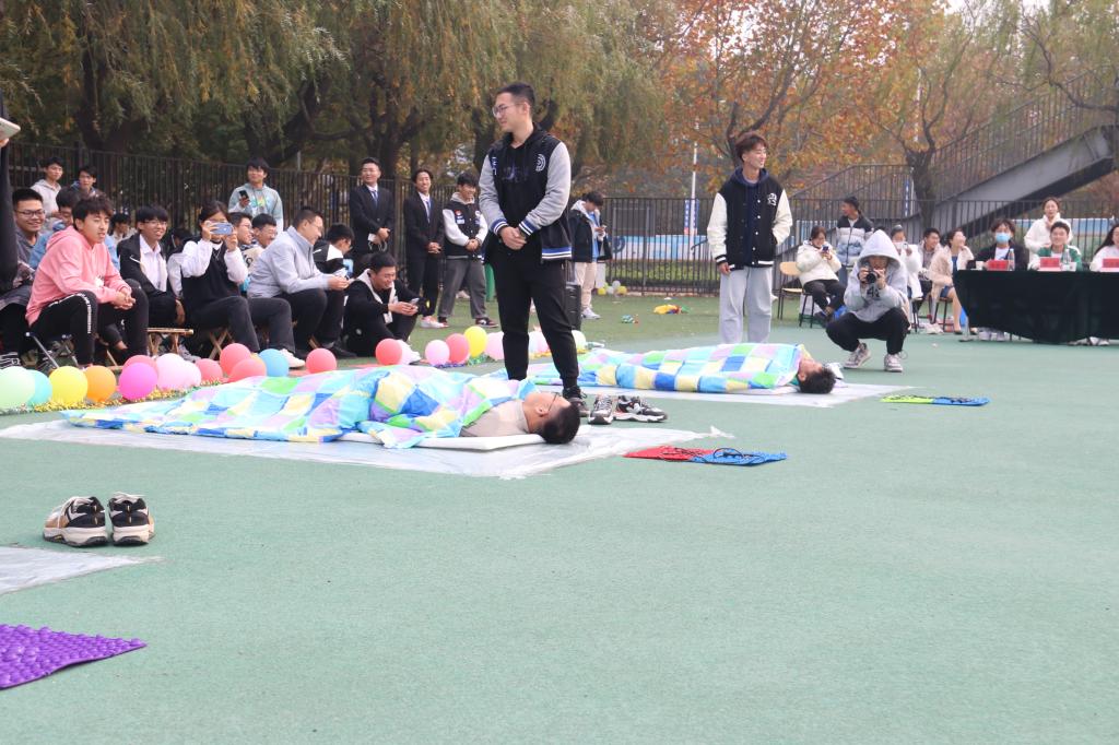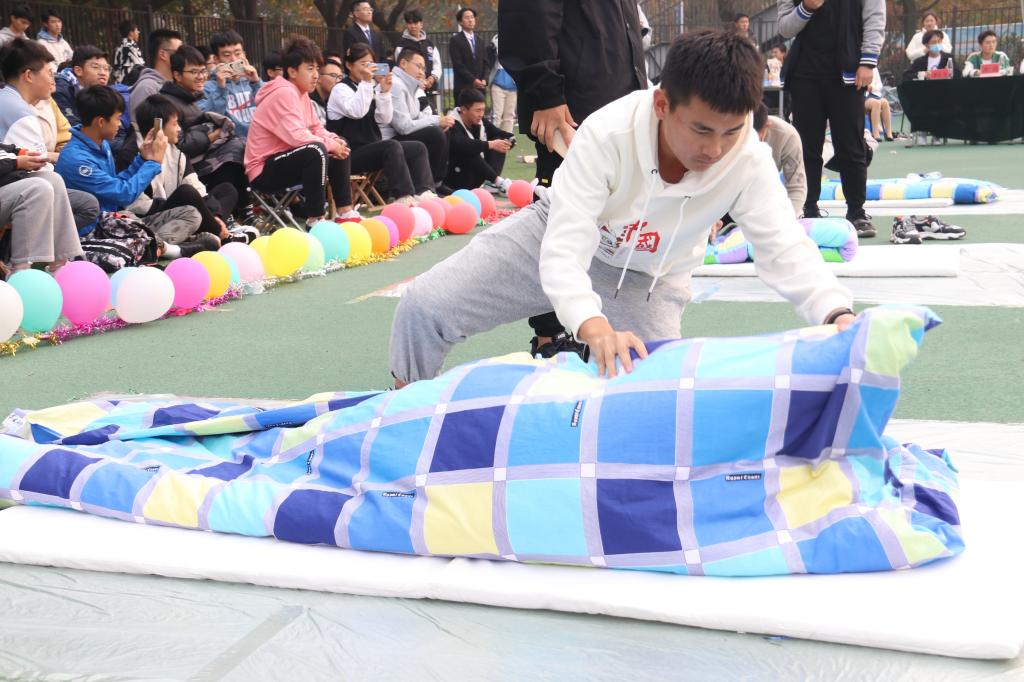 赛前,学生会两名文艺部干事带来的歌曲演唱节目活跃了现场气氛,拉开了比赛的序幕。此次军被大赛共有四个环节,分别是选手们从假寐中醒来,随着号声响起迅速叠被的“军号响起”、吹爆气球才能开始叠被的“气球大爆炸”、融合了两人三足与指压板跳绳等趣味游戏的“接力大作战”、需要全队齐心协力用小木棒传递胶带的“物资传递”,环节设计独具匠心。在计算最终成绩的等待时间,还举办了抢凳子的小游戏,现场观众们积极参与,气氛热烈。