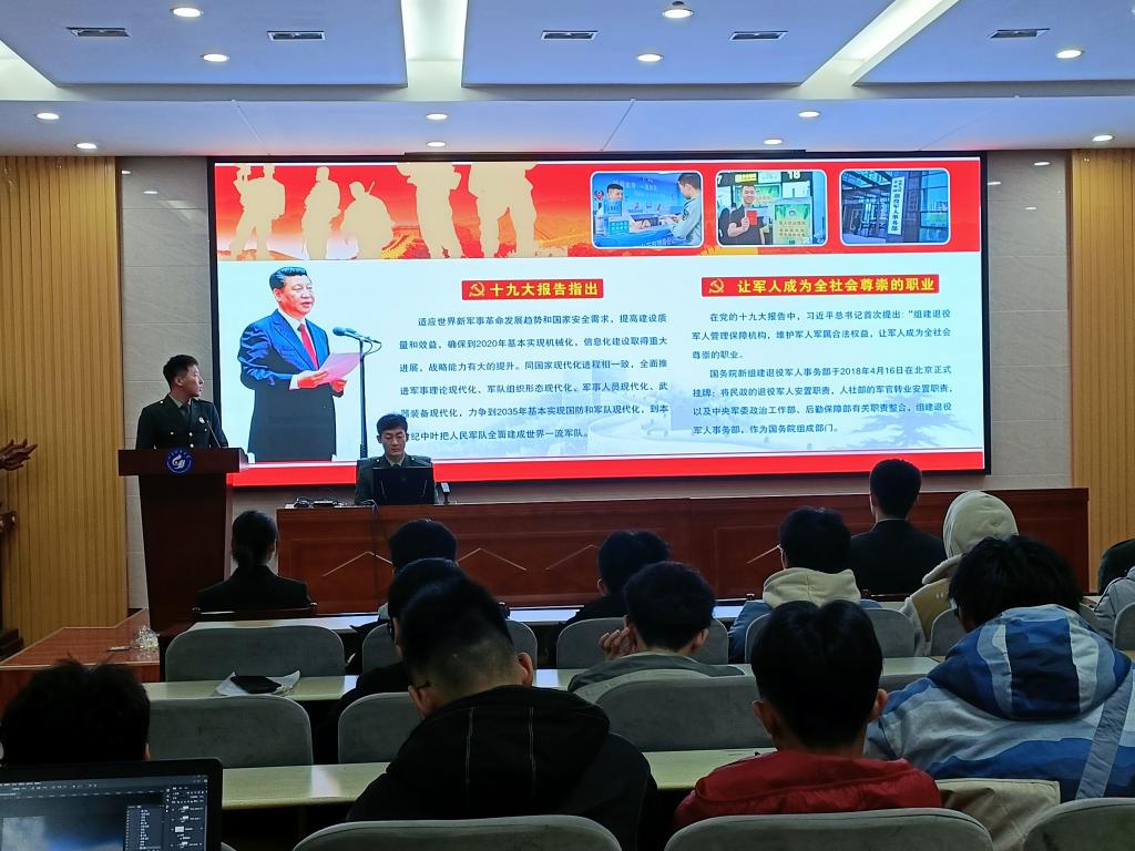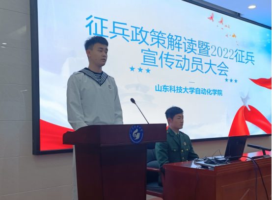 本次会议由学院辅导员韩梅主持召开,由退役复学的学生代表、2021级新生教官们讲述征兵相关事项。海军退伍复学的新生教官卢宗汉同学首先发言,他讲述了自己的军旅生活和参军之后对自己学习生活上的影响。随后,2020级退役复学学生孙玉芬介绍了女同学们参军需要注意的事项。会议进行一半,同学们兴致高昂。2021级退役复学学生丁永涛为解读了征兵政策,让同学们对参军政策有了更深入的了解。最后,全国大学生就业创业典型人物、“黄岛区最美大学生”、2019级退役复学学生徐越讲述了自己在中国人民解放军仪仗大队的生活,呼吁有入伍意愿的大学生积极报名参军。